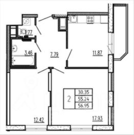 Общая площадь 55,2 м, просторные комнаты 17,93 м и 12,42 м, кухня 11,87 м с распашными панорамными дверьми на балкон 3,42 м, раздельный санузел, коридор с удобным местом под шкаф. Квартира без ремонта. Вы всё сделаете под свой вкус.