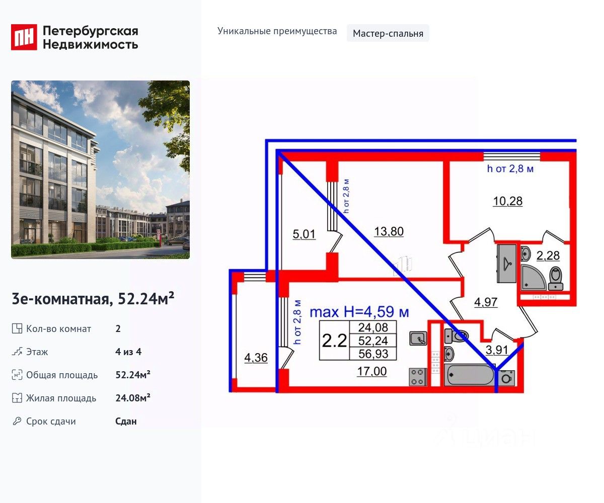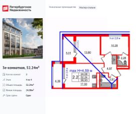 Уникальная, функциональная европланировка, большая кухня-гостиная 17 м², вместительная прихожая 4.97 м². Общая площадь квартиры - 52.24 м², жилая 24.08 м², высота потолка 4.59 м.