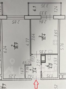 Общая площадь квартиры 34.7 кв.м. + балкон - 4.1 кв.м, комната 16.9 кв.м, кухня 10.4 кв.м, прихожая 3.4 кв.м, площадь санузла 4 кв.м.
