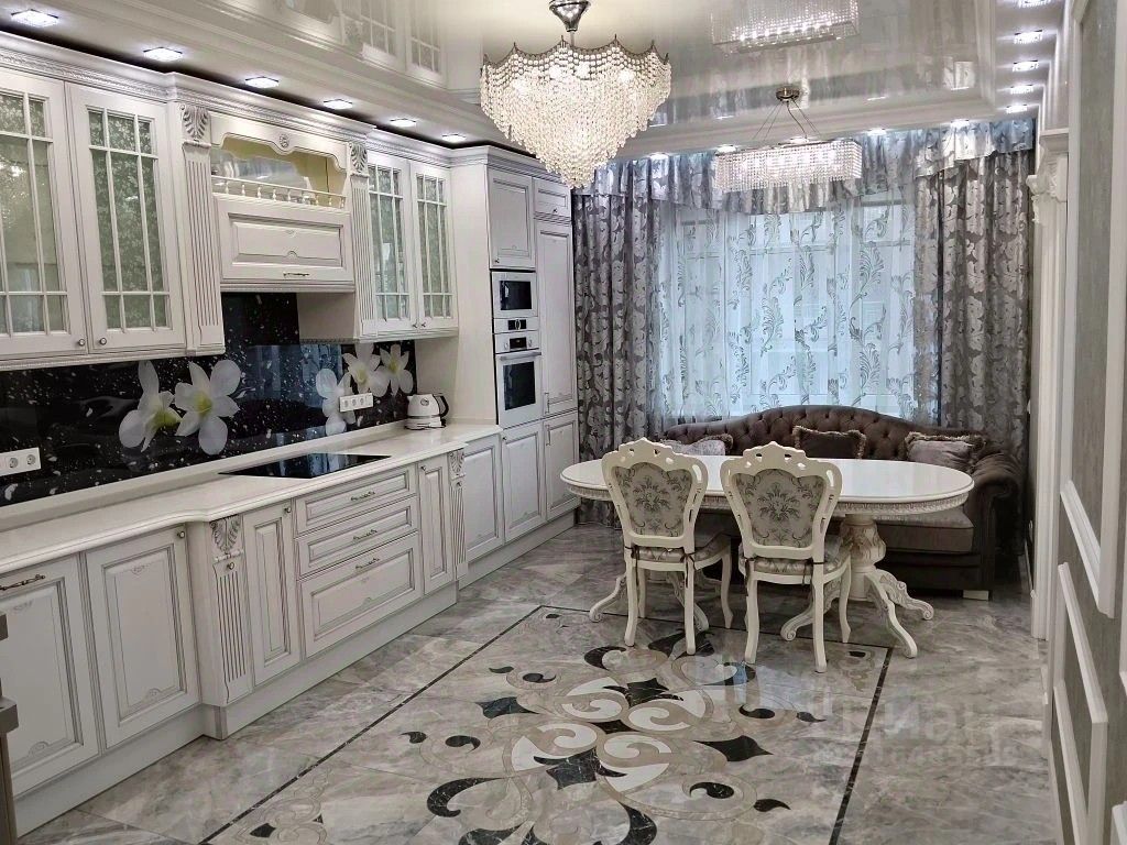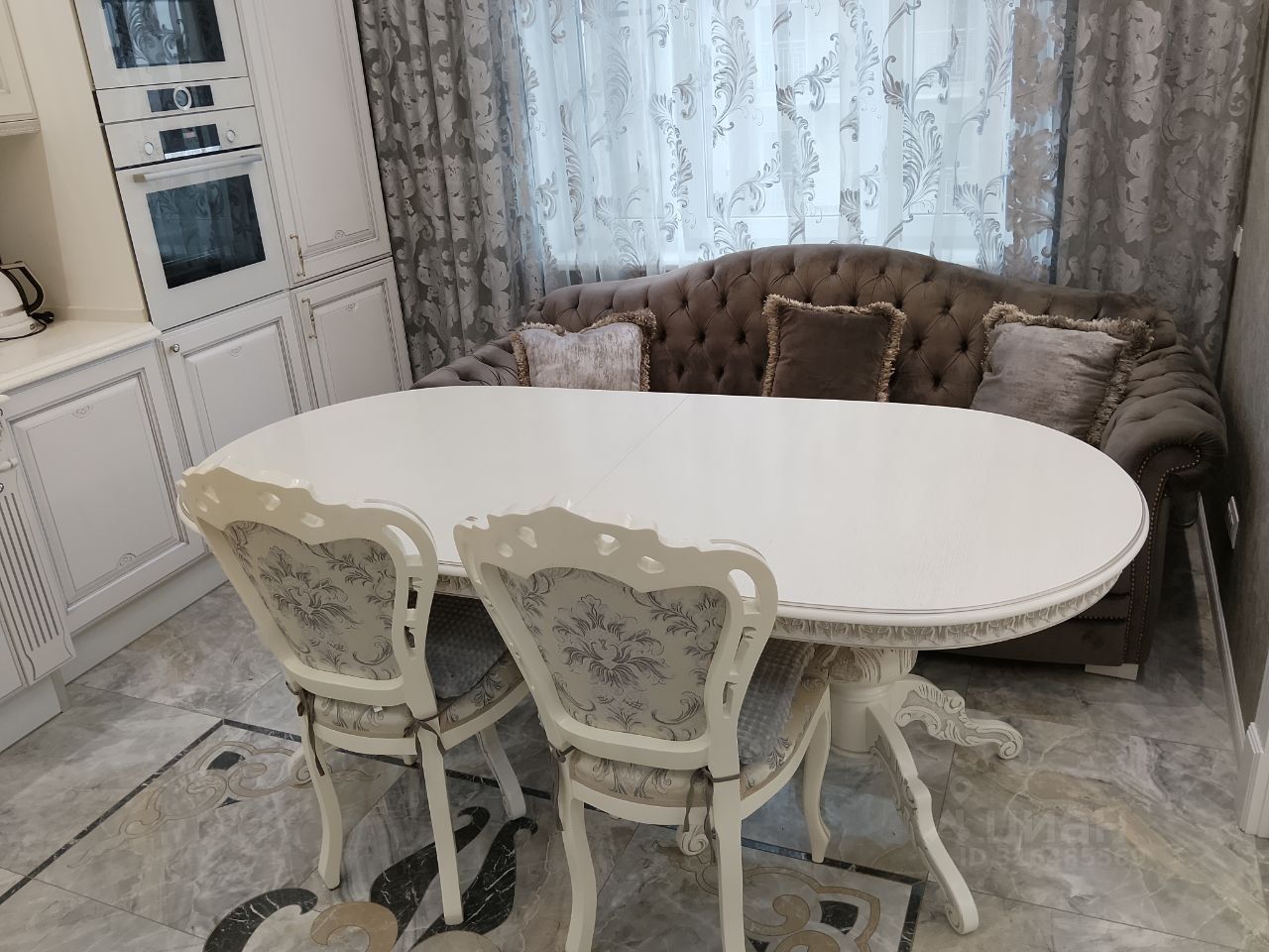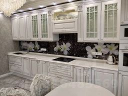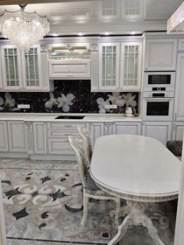 В кухне встроенный кухонный гарнитур итальянская классика белого цвета с серебряной патиной, столешница из натурального камня кварц, диван раскладной, встроенный холодильник Либхер, встроенная посудомоечная машина, микроволновая печь и духовка фирмы Bosch.