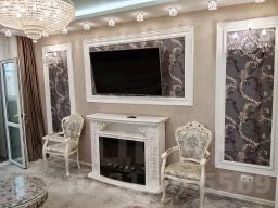 Во всей квартире установлены люстры, светильники, бра в классическом стиле. В интерьере на стенах молдинги. Двухуровневые потолки.