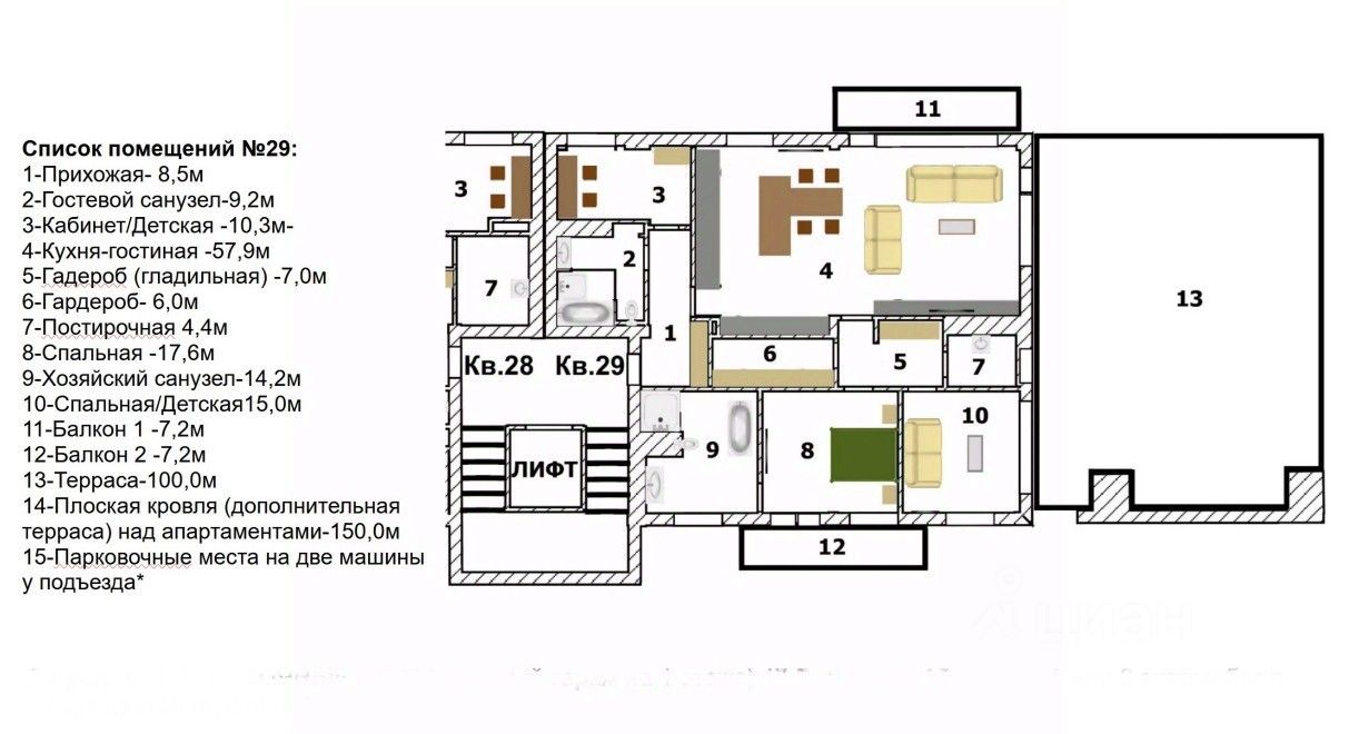 •Балконы 7,2 кв. м и 7,2 кв. м