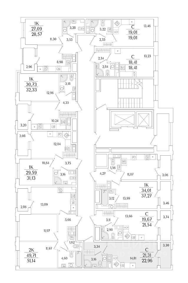 Квартира находится в 13 этажном доме, в Гранат - Корпус К1 на 4 этаже. Общая площадь квартиры 22,96 кв.м.