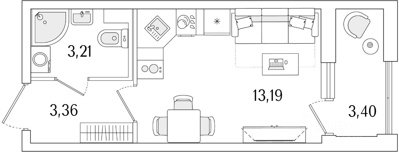 Квартира находится в 13 этажном доме, в Гранат - Корпус К1 на 1 этаже. Общая площадь квартиры 21,46 кв.м.