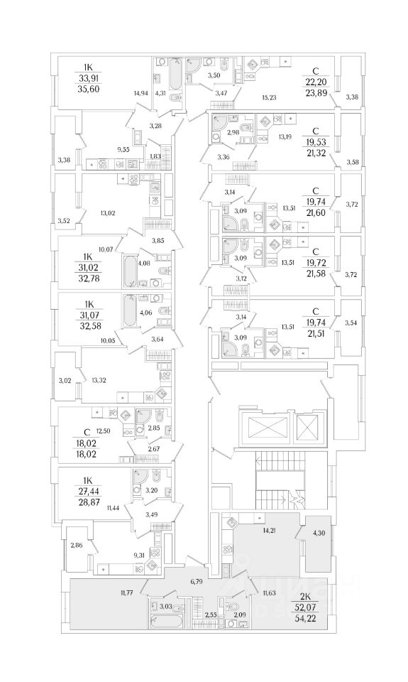 Квартира находится в 13 этажном доме, в Гранат - Корпус К1 на 2 этаже. Общая площадь квартиры 54,22 кв.м.