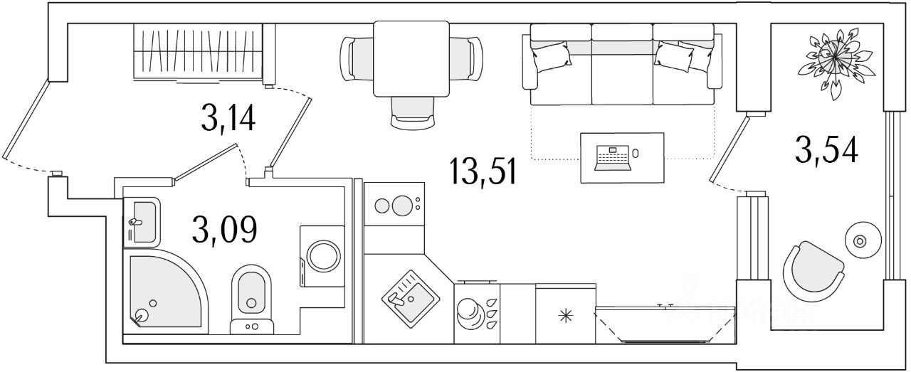 Квартира находится в 13 этажном доме, в Гранат - Корпус К1 на 2 этаже. Общая площадь квартиры 21,51 кв.м.
