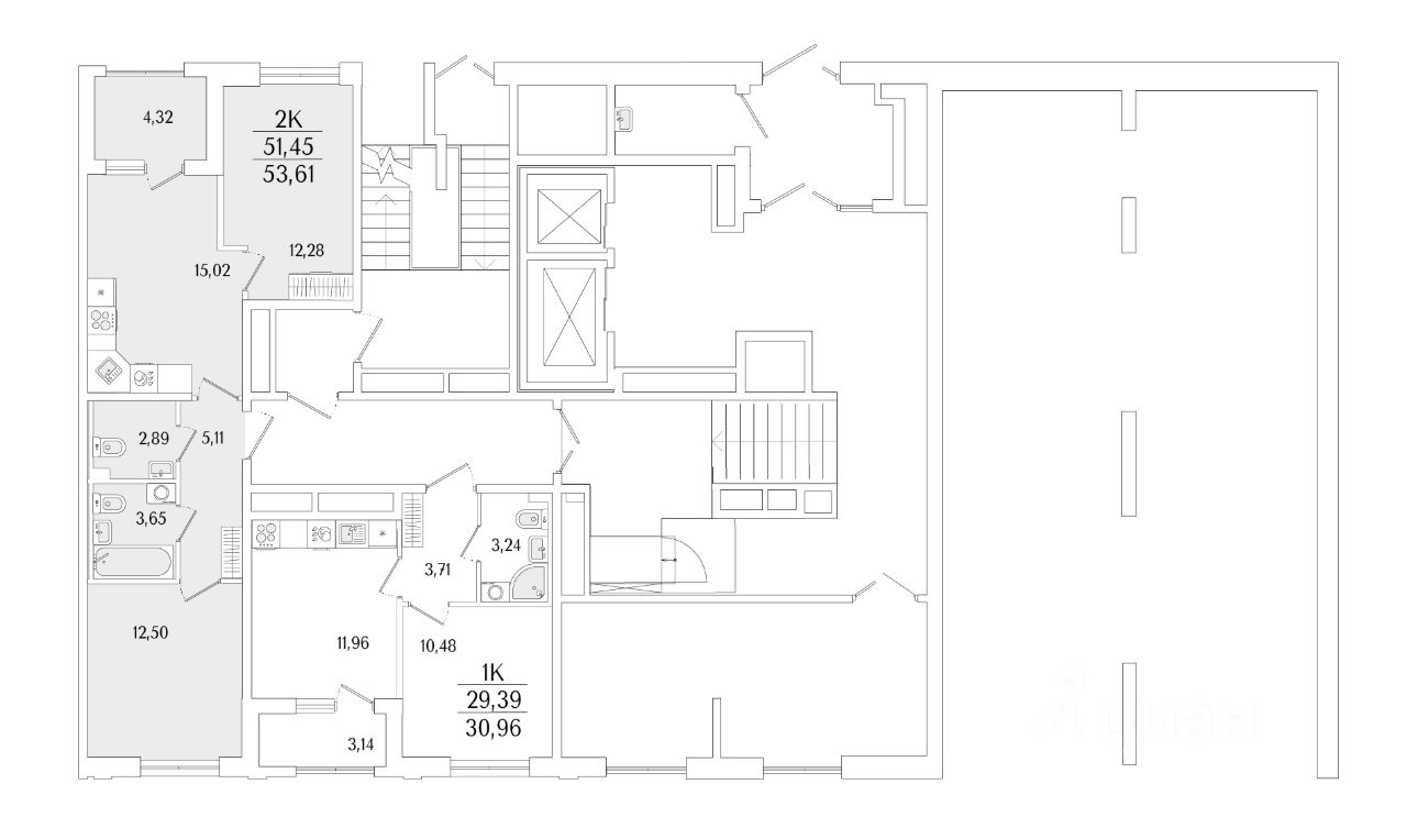 Квартира находится в 13 этажном доме, в Гранат - Корпус К1 на 1 этаже. Общая площадь квартиры 53,61 кв.м.