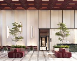 Двусветный холл связывает пространства внутреннего двора и улицы, является порталом в обособленный тихий двор жилого комплекса. Высокие витражи обеспечивают просматриваемость пространства, приглашая пройти внутрь.