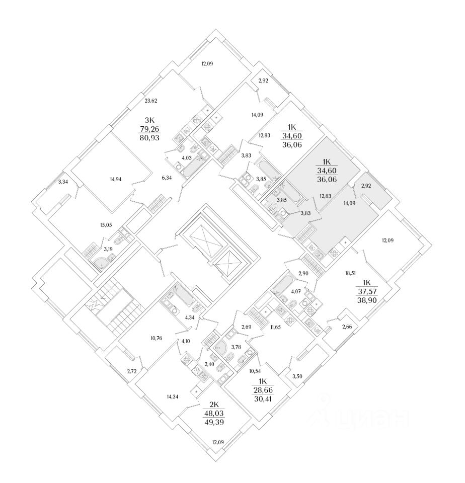 Квартира находится в 13 этажном доме, в Гранат - Корпус К2 на 9 этаже. Общая площадь квартиры 36,06 кв.м.