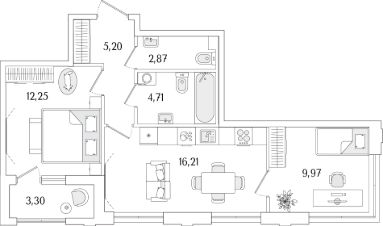 Квартира находится в 13 этажном доме, в Гранат - Корпус К1 на 2 этаже. Общая площадь квартиры 52,86 кв.м.
