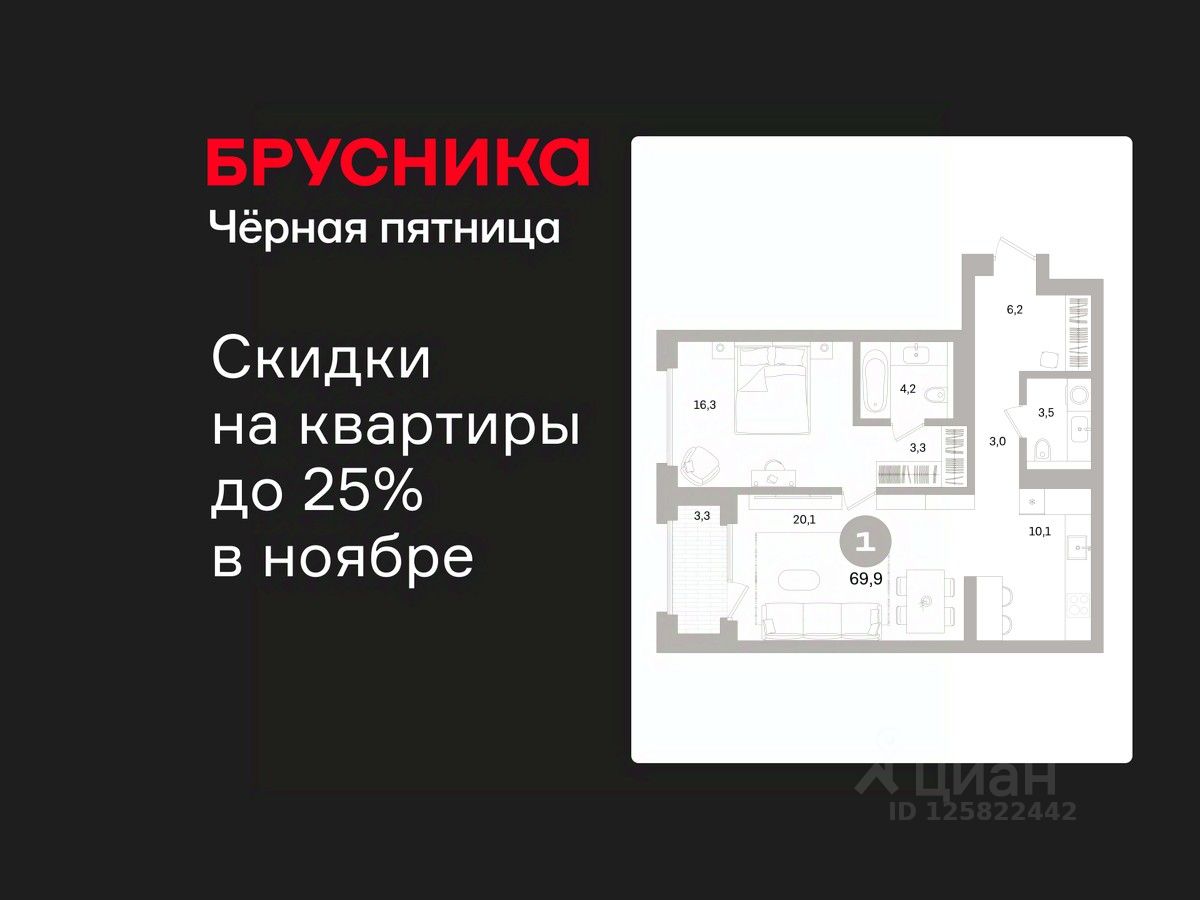 1-комн. квартира с предчистовой отделкой в ЖК "Северный ветер" на 11 этаже. Общая площадь: 69.86 кв.м., жилая: 16.3 кв.м., площадь просторной кухни-столовой: 30.2 кв.м. Все окна выходят на одну сторону. В квартире одна лоджия, один совмещенный и один раздельный санузел. Высота потолков 3.1 м.
