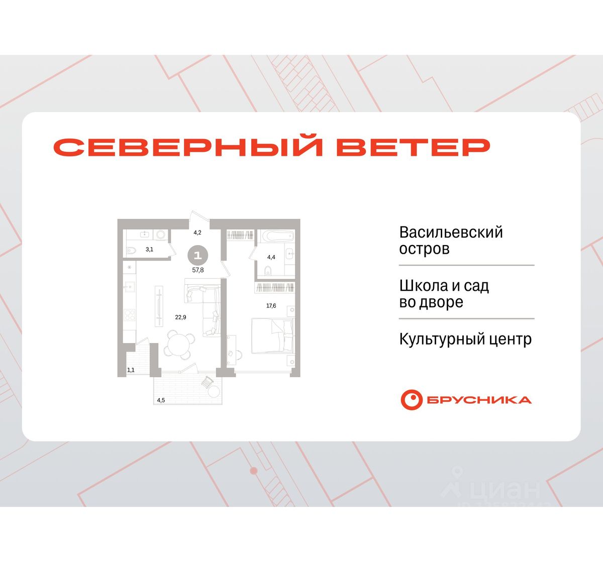 Продается однокомнатная квартира от застройщика с предчистовой отделкой в ЖК "Северный ветер" на 5 этаже. Общая площадь: 57.72 кв.м., жилая: 17.6 кв.м., площадь просторной кухни-столовой: 22.9 кв.м. Все окна выходят на одну сторону. В квартире один балкон и одна лоджия, один совмещенный санузел. Высота потолков 3.1 м.