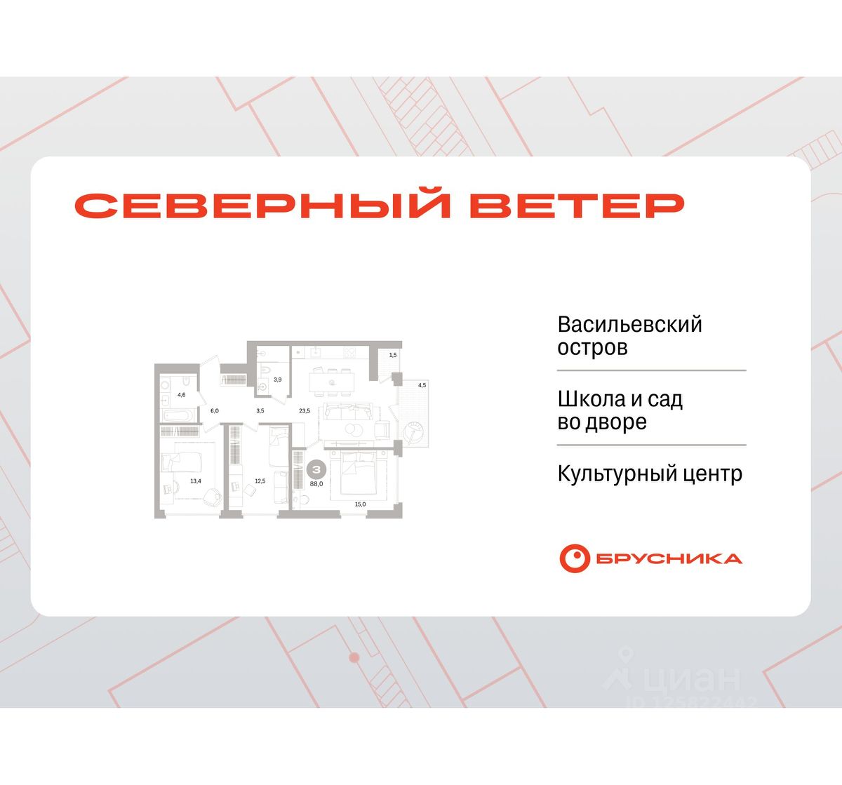 Продается трехкомнатная квартира от застройщика с предчистовой отделкой в ЖК "Северный ветер" на 6 этаже. Общая площадь: 87.28 кв.м., жилая: 40.9 кв.м., площадь просторной кухни-столовой: 23.5 кв.м. Квартира угловая, идеально подойдет любителям тишины и панорамных видов. В квартире один балкон и одна лоджия, два совмещенных санузла. Высота потолков 3.1 м.