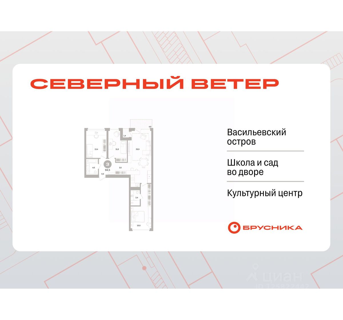3-комн. квартира с предчистовой отделкой в ЖК "Северный ветер" на 4 этаже. Общая площадь: 94.04 кв.м., жилая: 41.6 кв.м., площадь просторной кухни-столовой: 28.9 кв.м. Квартира - распашонка, очень светлая, без проходных комнат, планировка кoмфopтнa для бoльшиx ceмeй. В квартире один балкон и одна лоджия, два совмещенных санузла. Высота потолков 3.1 м.