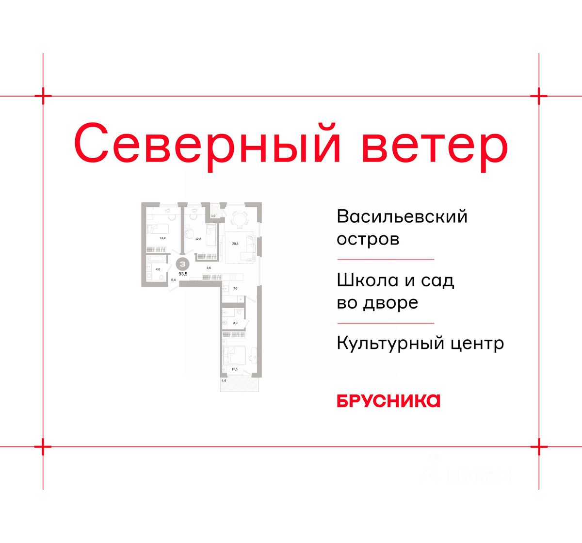 Продается 3-комн. квартира от застройщика с предчистовой отделкой в ЖК "Северный ветер" на 6 этаже. Общая площадь: 93.46 кв.м., жилая: 41.1 кв.м., площадь просторной кухни-столовой: 20.8 кв.м. Квартира без проходных комнат, окна выходят нa три cтopoны дома. В квартире одна лоджия, два совмещенных санузла. Высота потолков 3.1 м.