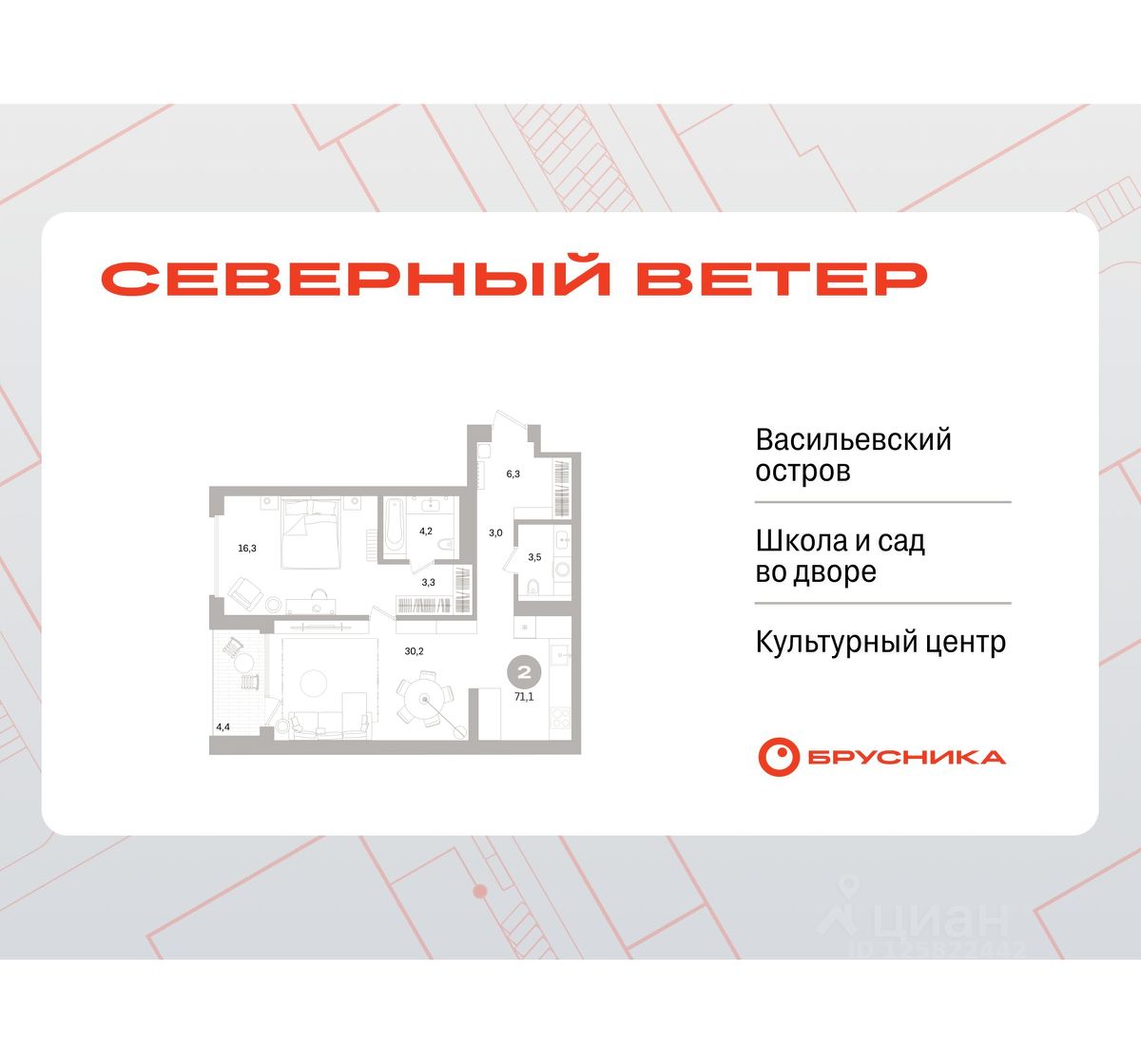 1-комн. квартира от застройщика с предчистовой отделкой в ЖК "Северный ветер" на 12 этаже. Общая площадь: 69.86 кв.м., жилая: 16.3 кв.м., площадь просторной кухни-столовой: 30.2 кв.м. Все окна выходят на одну сторону. В квартире одна лоджия, один совмещенный и один раздельный санузел. Высота потолков 3.1 м.