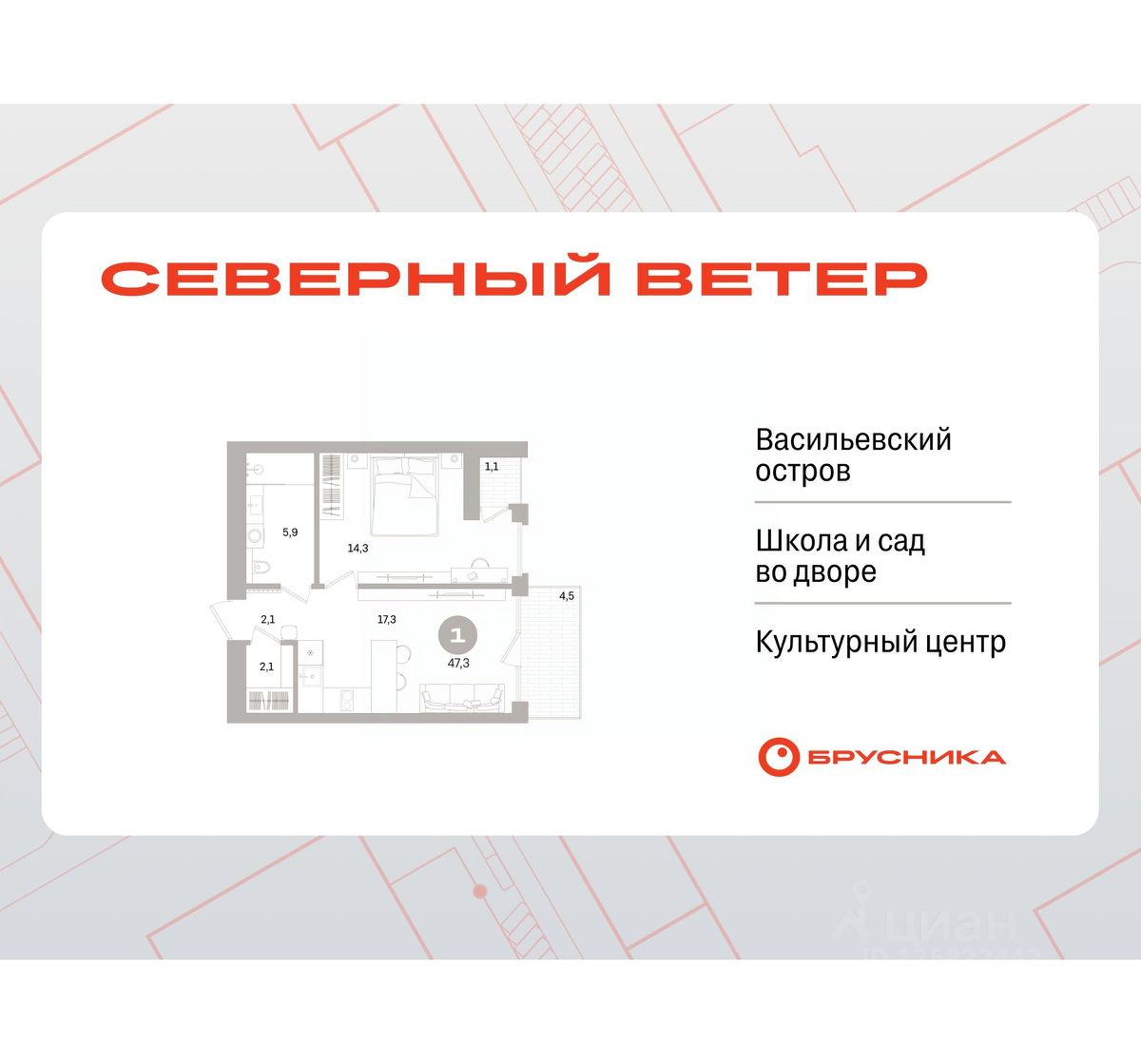 Просторная 1-комн. квартира с предчистовой отделкой в ЖК "Северный ветер" на 4 этаже. Общая площадь: 47.19 кв.м., жилая: 14.3 кв.м., площадь просторной кухни-столовой: 17.3 кв.м. Все окна выходят на одну сторону. В квартире один балкон и одна лоджия, один совмещенный санузел. Высота потолков 3.1 м.