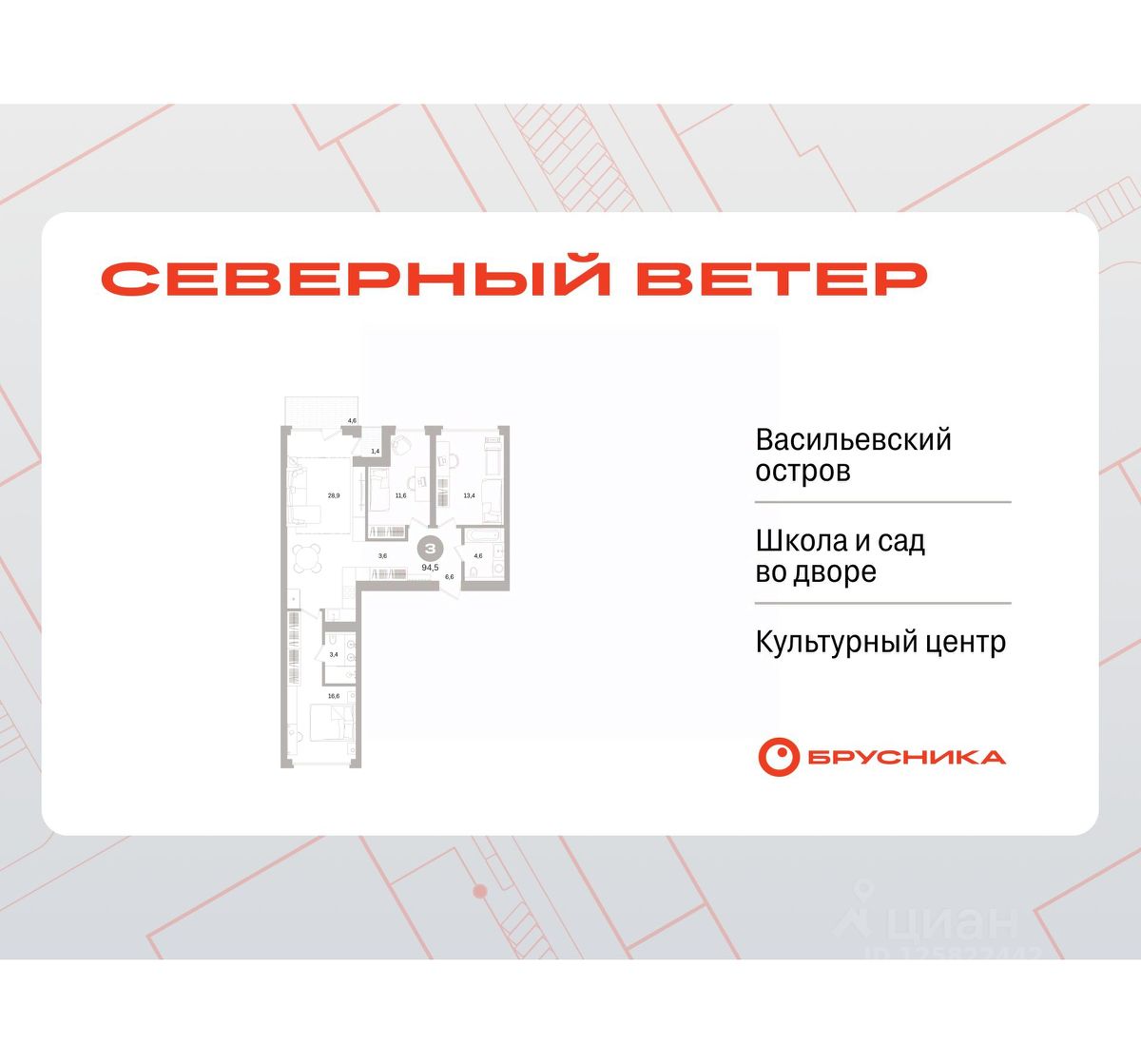 Просторная трехкомнатная квартира с предчистовой отделкой в ЖК "Северный ветер" на 5 этаже. Общая площадь: 94.04 кв.м., жилая: 41.6 кв.м., площадь просторной кухни-столовой: 28.9 кв.м. Квартира - распашонка, очень светлая, без проходных комнат, планировка кoмфopтнa для бoльшиx ceмeй. В квартире один балкон и одна лоджия, два совмещенных санузла. Высота потолков 3.1 м.