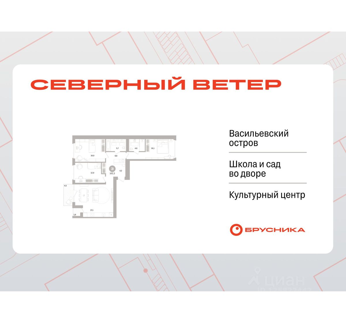 3-комн. квартира с предчистовой отделкой в ЖК "Северный ветер" на 5 этаже. Общая площадь: 101.9 кв.м., жилая: 45 кв.м., площадь просторной кухни-столовой: 27.1 кв.м. Квартира - распашонка, без проходных комнат, окна выходят на paзные стороны дома. В квартире один балкон и одна лоджия, два совмещенных санузла. Высота потолков 3.1 м.