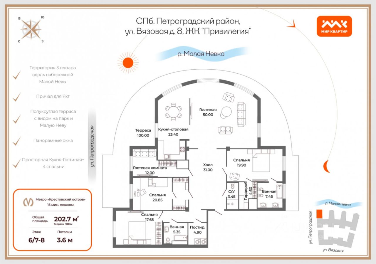 Арт. 98108859 Вас ждет исключительное предложение на рынке премиальной недвижимости — квартира с великолепной планировкой, расположенная в самом модном доме Крестовского острова. С полукруглой террасы открывается живописный вид на Неву, что делает данное жилье поистине уникальным.