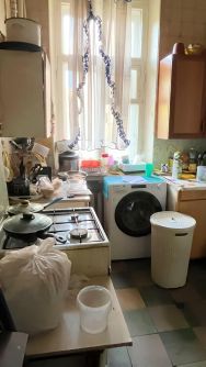На кухне есть всё нужное:газовая плита, стол, шкафчик, удобное место под стиральную машину.