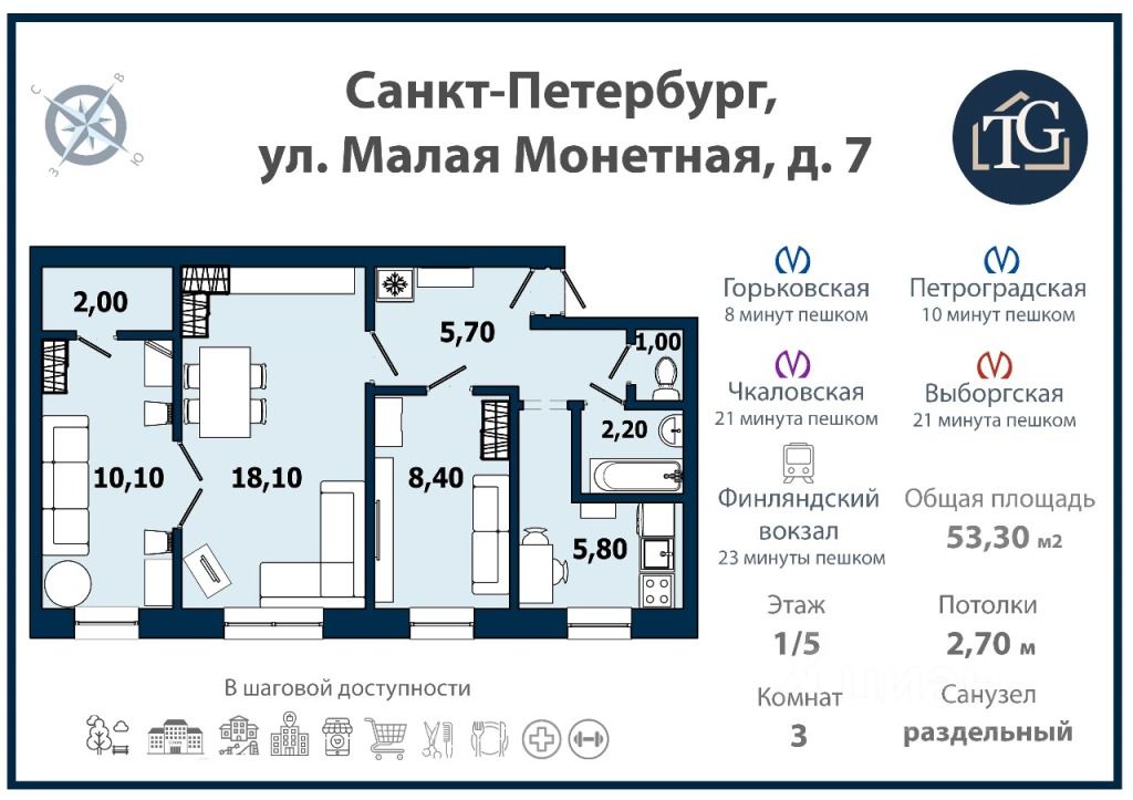 До "Горьковской" 8-9 минут ходьбы. До "Петроградской" 12 минут.