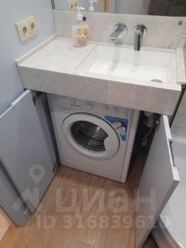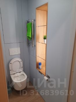 В санузле установлена душевая система с тропическим душем, удобная красивая раковина из акрилового камня над стиральной машиной и унитаз-инсталляция. Декоративные стеклянные полки в нише из шпона дуба, корзина для грязного белья, шкаф для бытовой химии над инсталляцией с возможностью установки бойлера при необходимости. Установлена принудительная приточно-вытяжная вентиляция с автоматическим выключением и выключением. Стиральная машинка Indеsit. Зеркало с системой антизапотевания.