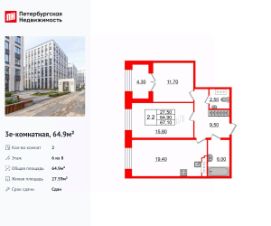 Удобная, классическая, функциональная европланировка, большая кухня-гостиная 19.49 м², просторная прихожая 9.49 м². Общая площадь квартиры - 64.9 м², жилая 27.59 м², высота потолка 3 м.