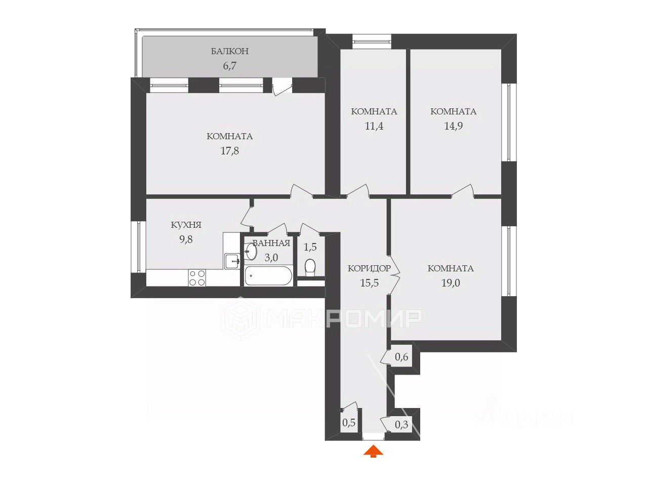Просторная 4-х комнатная квартира на три стороны. Все окна выходят во двор.