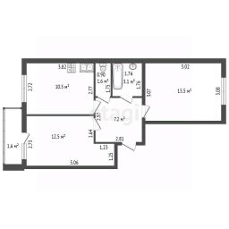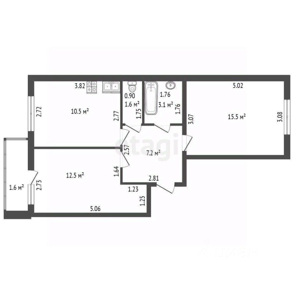 Площадь 50.4 м². Просторная кухня-гостиная и две изолированные спальни.