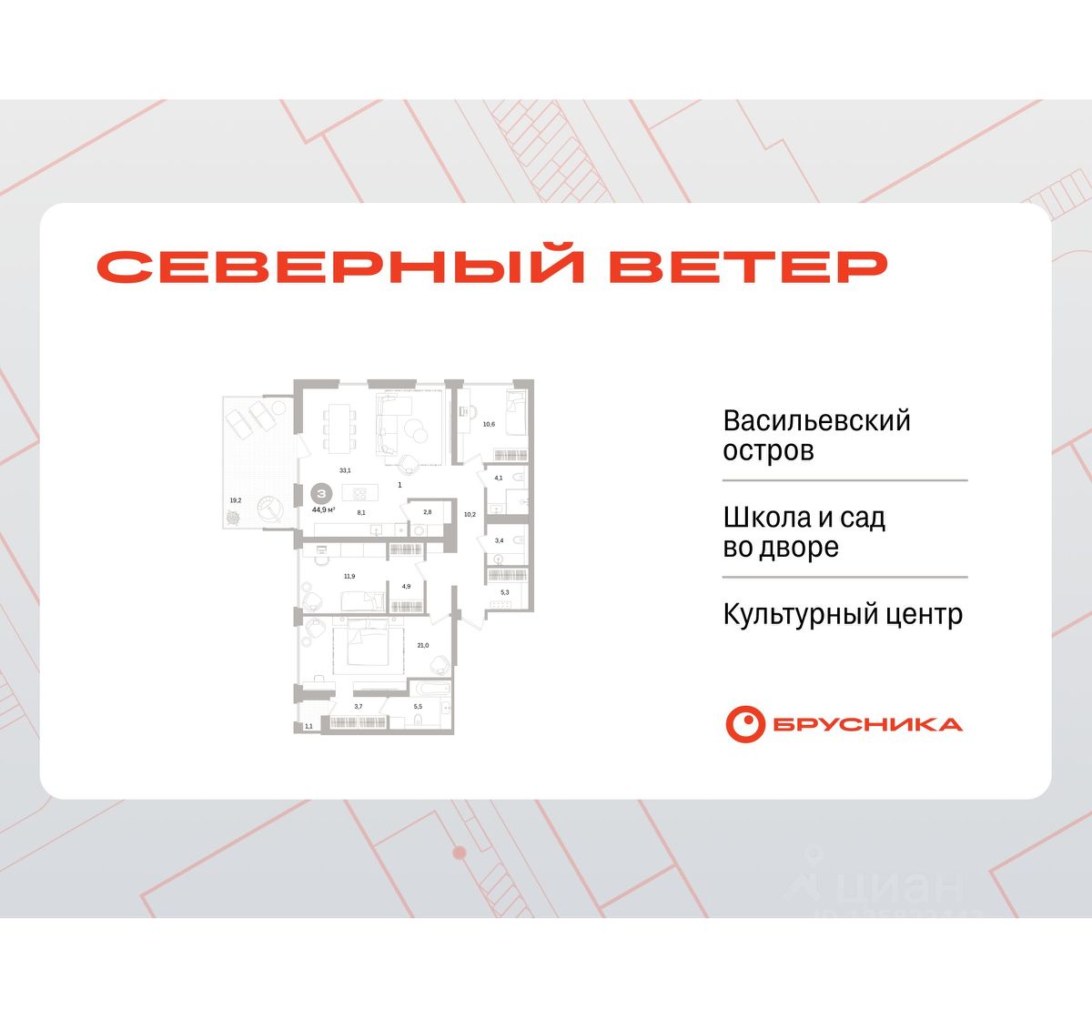 Просторная 3-комн. квартира с предчистовой отделкой в ЖК "Северный ветер" на 2 этаже. Общая площадь: 144.9 кв.м., жилая: 43.5 кв.м., площадь просторной кухни-столовой: 41.2 кв.м. Угловая квартира, окна oбecпeчивaют paвнoмepнoe ocвeщeниe в тeчeниe дня. В квартире один балкон и одна лоджия, два совмещенных и один раздельный санузел. Терраса представляет собой роскошную зону отдыха, где вы на свой вкус можете создать атмосферу комфорта и уюта. Высота потолков 3.1 м.