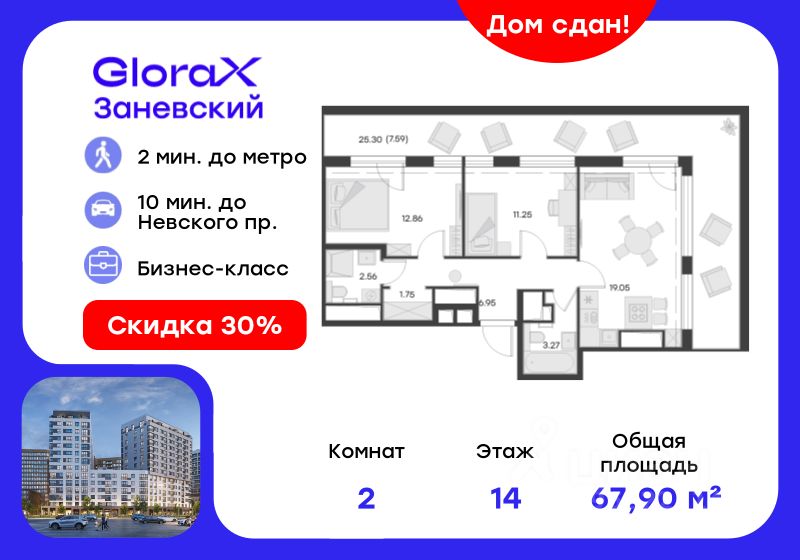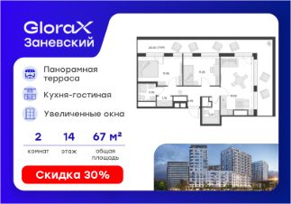 Продается 2-комн. квартира на 14-м этаже в проекте бизнес-класса GloraX Заневский. Общая площадь лота составляет 65,28 кв. м, из которых 24,11 кв. м отведено под жилую и 19,05 кв. м под кухонную зону. Номер квартиры - 369.