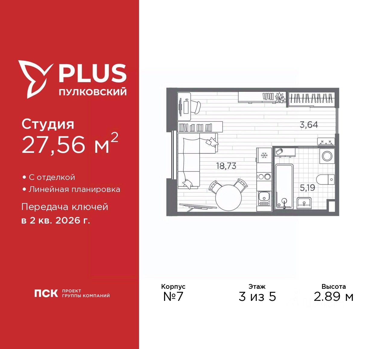 Просторная 1-комн. квартира-студия с отделкой в ЖК "PLUS Пулковский" на 3 этаже. Общая площадь: 27.56 кв.м., площадь гостиной 18.73 кв.м., из которых 5 кв.м. выделено под кухонную зону. Все окна выходят на одну сторону. В квартире один совмещенный санузел. Высота потолков 2.89 м.