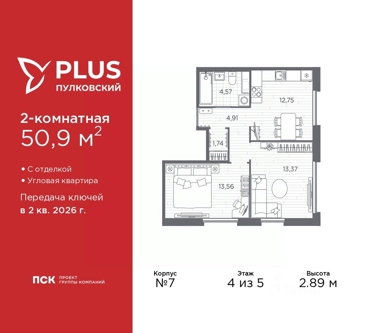 Продается 2-комн. квартира от застройщика с отделкой в ЖК "PLUS Пулковский" на 4 этаже. Общая площадь: 50.9 кв.м., жилая: 26.93 кв.м., площадь просторной кухни-столовой: 12.75 кв.м. Квартира угловая, очень светлая, естественная вентиляция при открытии окон. В квартире один совмещенный санузел. Высота потолков 2.89 м.