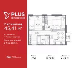 Двухкомнатная квартира от застройщика с отделкой в ЖК "PLUS Пулковский" на 5 этаже. Общая площадь: 45.41 кв.м., жилая: 22.63 кв.м., площадь просторной кухни-столовой: 9.68 кв.м. Квартира угловая, идеально подойдет любителям тишины и панорамных видов. В квартире один балкон, один совмещенный санузел. Высота потолков 2.75 м.
