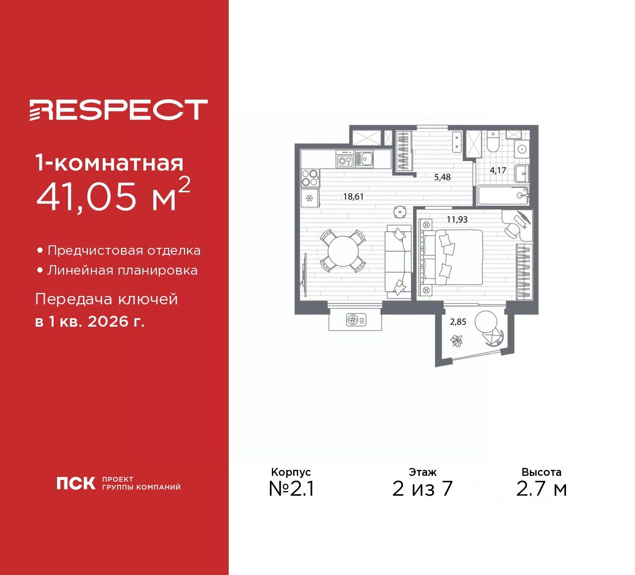 1-комн. квартира от застройщика с предчистовой отделкой в ЖК "RESPECT" на 2 этаже. Общая площадь: 41.05 кв.м., жилая: 11.93 кв.м., площадь просторной кухни-столовой: 18.61 кв.м. Все окна выходят на одну сторону. В квартире один балкон, один совмещенный санузел. Высота потолков 2.7 м.