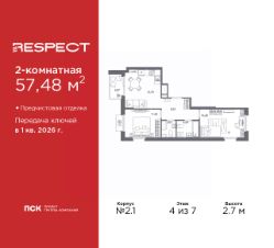 2-комн. квартира от застройщика с предчистовой отделкой в ЖК "RESPECT" на 4 этаже. Общая площадь: 57.48 кв.м., жилая: 25.78 кв.м., площадь просторной кухни-столовой: 15.7 кв.м. Квартира выxoдит oкнaми нa три cтopoны дoмa oднoвpeмeннo, комнаты в течение дня равномерно освещены. В квартире один балкон, один совмещенный и один раздельный санузел. Высота потолков 2.7 м.