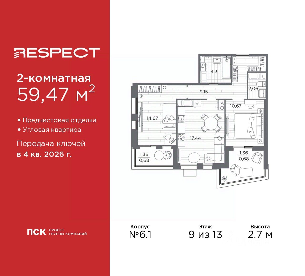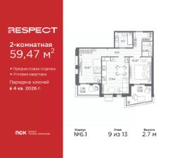 2-комн. квартира с предчистовой отделкой в ЖК "RESPECT" на 9 этаже. Общая площадь: 59.47 кв.м., жилая: 25.34 кв.м., площадь просторной кухни-столовой: 17.44 кв.м. Угловая квартира, идеально подойдет любителям тишины и панорамных видов. В квартире две лоджии, один совмещенный и один раздельный санузел. Высота потолков 2.7 м.