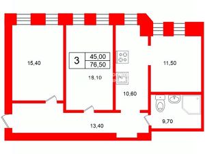 Идеальная планировка: 2 изолированные комнаты 15,4 м2 и 18,1 м2, кухня с выходом в столовую с зоной для семейных ужинов, просторная прихожая и большой санузел.