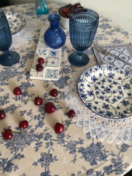 Кухня с орнаментами и цветовой гаммой в стиле мотивов Гжель включает посудомоечную машину, компактный холодильник с морозильной камерой, стол и 2 мягких стула.