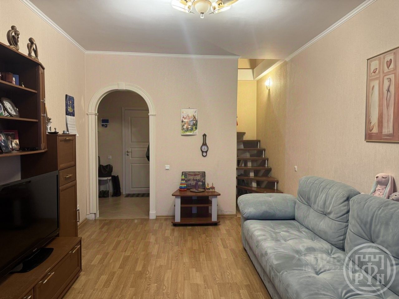 На 6-м этаже расположены просторная гостиная (17,4 кв. м) с эркером и кондиционером, кухня (10,3 кв. м) с выходом на балкон. Санузел с душевой кабиной, установлен электрический тёплый пол.
