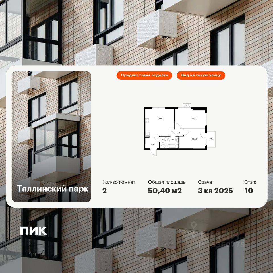 Продаётся 2-комн. квартира площадью 50,4 кв.м на 10 этаже 12 этажного дома (Корпус 3.3, Секция 1) проекта ПИК Таллинский парк. Светлый просторный подъезд на уровне земли, функциональная планировка, большие окна, предчистовая отделка.