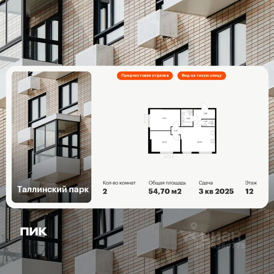 Продаётся 2-комн. квартира площадью 54,7 кв.м на 12 этаже 12 этажного дома (Корпус 3.1, Секция 1) проекта ПИК Таллинский парк. Светлый просторный подъезд на уровне земли, функциональная планировка, большие окна, предчистовая отделка.