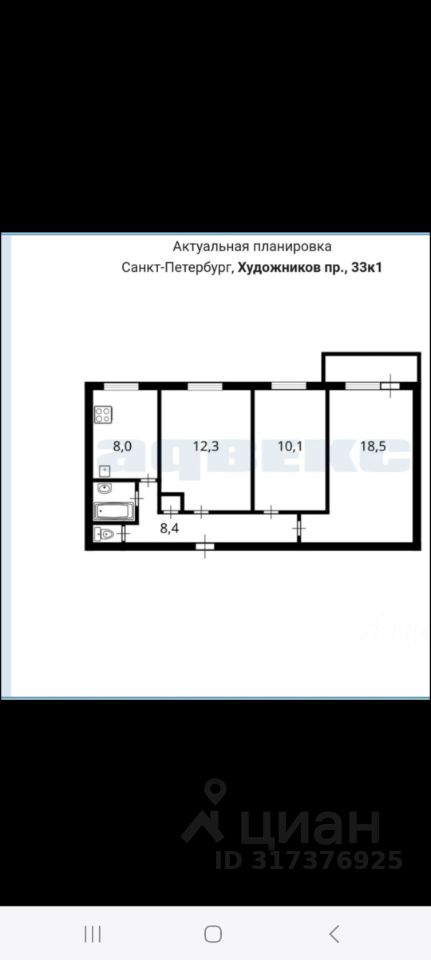 Кто поставил лайк, то свяжитесь, пожалуйста. Для Вашего спокойствия можно обратиться к агенту по сопровождению сделки. Продается уютная трехкомнатная квартира от собственника в Санкт-Петербурге на проспекте Художников, 33к1Ж. Улучшенная планировка 1ЛГ-606. Общая площадь квартиры составляет 61 кв. м, из которых 41.4 кв. м - жилая площадь. Квартира расположена на 7 этаже 9-этажного дома. Высота потолков - 2.5 метра. Окна выходят во двор, что обеспечивает тишину и спокойствие. Квартира в руках одной семьи со времени постройки дома. Тёплая. Широкие подоконники. Внутри- комнатные двери из целого деревянного массива. Паркетные полы в комнатах. Балкон 0,8м2. Встроенный шкаф. Две антрисоли. Развитая инфраструктура. Школа с английским языком, детский сад, магазины,поликлиники, Сосновка, сад Фомина.