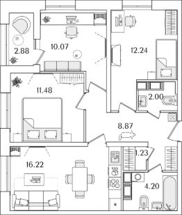 Квартира находится в 22 этажном доме, в Корпус 5 на 16 этаже. Общая площадь квартиры 67,75 кв.м.