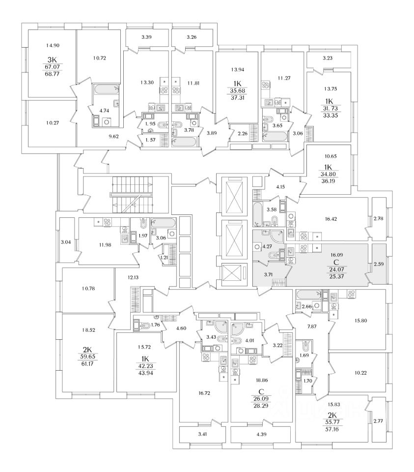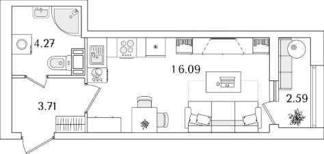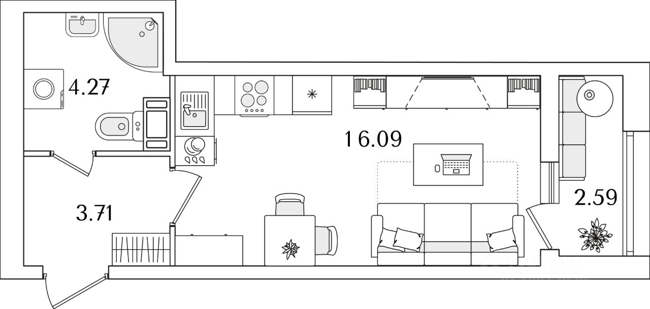 Квартира находится в 22 этажном доме, в Корпус 5 на 9 этаже. Общая площадь квартиры 25,37 кв.м.