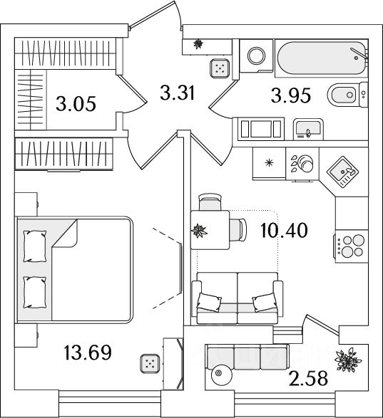 Квартира находится в 23 этажном доме, в Корпус 4 на 10 этаже. Общая площадь квартиры 35,40 кв.м.