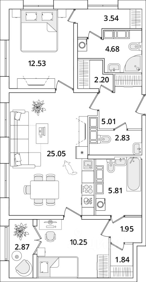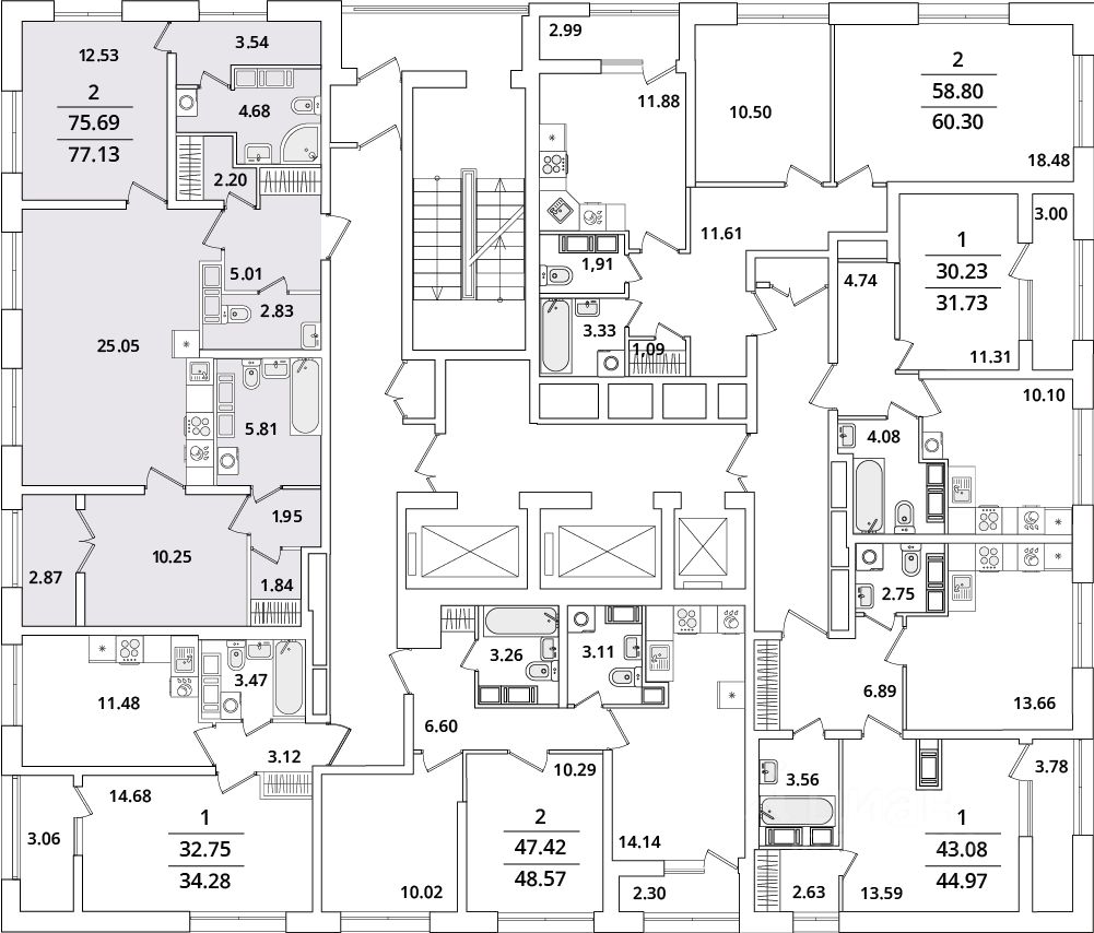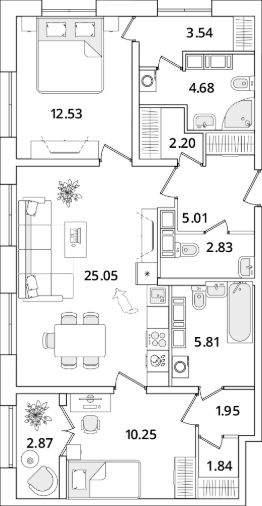 Квартира находится в 22 этажном доме, в Корпус 3 на 20 этаже. Общая площадь квартиры 77,30 кв.м.