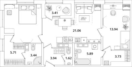 Квартира находится в 22 этажном доме, в Корпус 3 на 20 этаже. Общая площадь квартиры 75,80 кв.м.