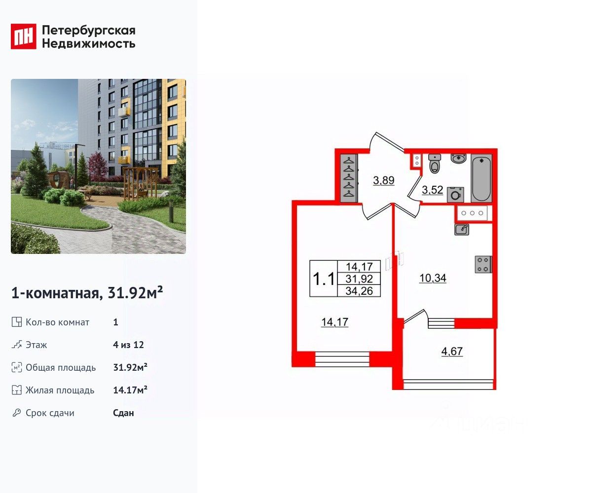 Удобная, классическая планировка, кухня 10.34 м², вместительная прихожая 3.89 м². Общая площадь квартиры - 31.92 м², жилая 14.17 м², высота потолка 2.77 м.
